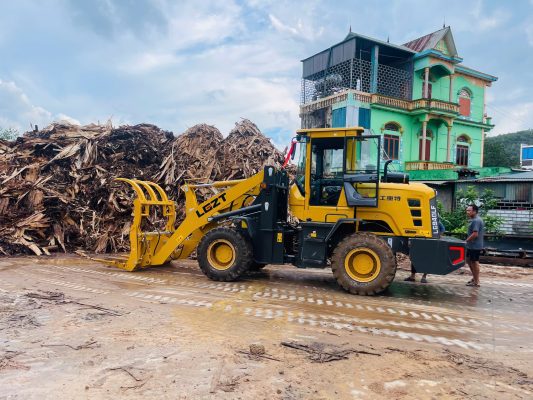 🔹 Xúc, kẹp gỗ tròn, gỗ xẻ, vỏ cây trong xưởng cưa, nhà máy chế biến gỗ.